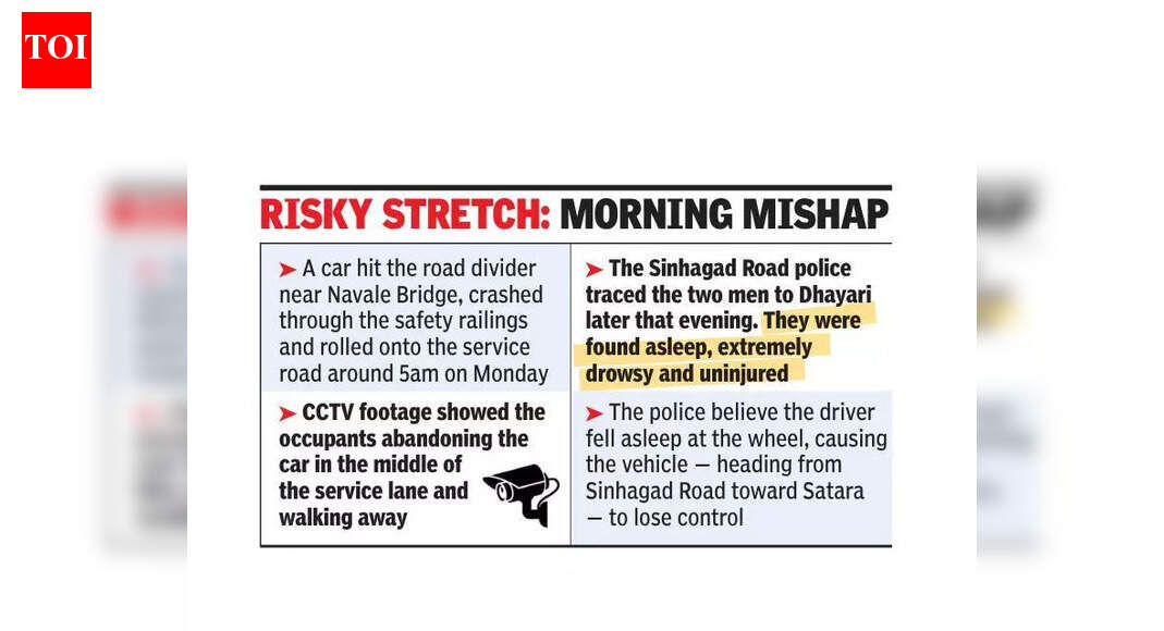 पुणे: सोमवारी पहाटे 5 च्या सुमारास वडगाव पूल ते नवले पुलादरम्यान एक कार रस्ता दुभाजकावर आदळली आणि त्यात 13 नोव्हेंबर रोजी झालेल्या भीषण अपघातासह अपघातांच्या मालिकेत भर पडली, ज्यात आठ जणांचा मृत्यू झाला. सिंहगड रोड पोलिसांनी दिलेल्या माहितीनुसार, डिव्हायडरला धडकल्यानंतर वाहन डावीकडे वळले, सुरक्षा रेलिंग तोडून सर्व्हिस रोडवर खाली वळले. सिंहगड रोड पोलिसांचे सीनियर इन्स्पेक्टर दिलीप धैंगडे म्हणाले, “सिहगड रोड पोलिसांचे सीनियर इन्स्पेक्टर दिलीप धईंगडे यांनी सांगितले की, “भोसलेल्यांनी कार सर्व्हिस लेनच्या मधोमध टाकून दिली आणि तेथून निघून गेले.त्यानंतर सायंकाळी पोलिसांनी दोघांचा धायरी येथे माग काढला. “ते घरी परतले आणि लगेच झोपी गेले, कारण ते खूप तंद्रीत होते. सुदैवाने, त्यांना कोणतीही दुखापत झाली नाही. आमची टीम आता त्यांना अपघात कसा झाला याबद्दल मूलभूत प्रश्न विचारत आहे,” वरिष्ठ निरीक्षक म्हणाले.ही कार सिंहगड रोडवरून साताऱ्याच्या दिशेने जात असताना हा अपघात झाला, असे पोलिसांनी सांगितले. धैंगडे पुढे म्हणाले, “ड्रायव्हर झोपला आणि वाहनावरील नियंत्रण सुटले, असा आम्हाला संशय आहे,” धैंगडे पुढे म्हणाले.13 नोव्हेंबर रोजी पुणे-बेंगळुरू महामार्गावरील भूमकर पूल-नवले पूल मार्गावर मुंबईकडे जाणाऱ्या ट्रेलर ट्रकने 13 वाहनांना धडक दिल्याने आठ जण ठार आणि 13 जखमी झाले. ट्रेलर ट्रकने एका कारला अनेक मीटरपर्यंत खेचले आणि दुसऱ्या ट्रकवर आदळल्यानंतर थांबला.कात्रज-देहू रोड बायपासच्या नवले पुलावरील ३० किमी प्रतितास वेग मर्यादा सर्व वाहनांसाठी मंगळवारपासून लागू होणार आहे.