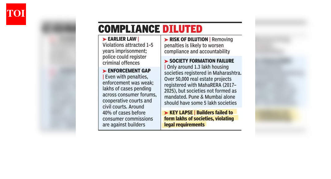 31 डिसेंबर रोजी मुख्यमंत्र्यांना संबोधित केलेल्या तपशीलवार निवेदनात, ग्राहक संस्थेने चेतावणी दिली की बदलांमुळे फ्लॅट खरेदीदारांना संरक्षण देण्याच्या एमओएफएच्या मूळ उद्दिष्टाला खीळ बसते आणि परिणामी सामान्य लोकांवर मोठ्या प्रमाणात अन्याय होईल.ग्राहक पंचायतीचे पदाधिकारी विजय सागर म्हणाले की MOFA मध्ये सुधारणा करण्याचा आणि RERA अंतर्गत 1 मे 2016 नंतर नोंदणीकृत प्रकल्प वगळण्याच्या राज्य सरकारच्या निर्णयामुळे हा कायदा मोठ्या प्रमाणात कुचकामी ठरला. “शासनाने दंडात्मक तरतुदी तटस्थ करून कायद्याची भीती दूर केली आहे. जे बिल्डर करारांचे उल्लंघन करतात, प्रकल्प सोडून देतात किंवा खरेदीदारांकडून पैसे उकळतात ते बदलांसह कोणत्याही कायदेशीर कारवाईपासून मुक्त आहेत,” सागरने TOI ला सांगितले.मेमोरँडमनुसार, सुमारे 10 महत्त्वपूर्ण MOFA तरतुदी ज्यात पूर्वी कारावास, दंड आणि फौजदारी खटला भरण्याची तरतूद होती त्या दुरुस्तीमध्ये हटवण्यात आल्या. त्यात कलम 13 (1) — कलम 3, 4, 5, 10 आणि 11, कलम 11 चे उल्लंघन केल्याबद्दल तीन वर्षांपर्यंत तुरुंगवास किंवा दंडाची तरतूद — बिल्डरांना जमीन आणि इमारती गृहनिर्माण संस्था किंवा सदनिका खरेदीदारांच्या संघटनांना देणे बंधनकारक करणे, आणि कलम 14, कंपनीचे संचालक, भागीदार आणि गुन्हेगारी अधिकाऱ्यांचे व्यवस्थापन करणे यासंबंधीचा समावेश आहे.आता कुचकामी ठरलेल्या इतर तरतुदींमध्ये व्यवसाय प्रमाणपत्रानंतर वेळेवर ताबा मिळणे, बांधकामाच्या ठिकाणी मंजूर योजनांचे अनिवार्य प्रदर्शन, संपूर्ण प्रकल्प माहिती उघड करणे, फ्लॅटच्या किमतीच्या 20% पेक्षा जास्त न स्वीकारल्यानंतर विक्री करारांची अंमलबजावणी आणि नोंदणी, स्वतंत्र बँक खात्यांमध्ये खरेदीदारांचे आगाऊ पेमेंट राखणे, तीन बांधकाम योजनेनुसार बांधकाम योजनेनुसार स्वतंत्र बँक खात्यांमध्ये अर्ज करणे. महिने आणि सोसायटी नोंदणीच्या चार महिन्यांच्या आत कन्व्हेयन्स कार्यान्वित करणे.या पत्रात असेही म्हटले आहे की कलम 13 रद्द करून, राज्याने बिल्डर्सच्या गुन्ह्यांना प्रभावीपणे कायदेशीर संरक्षण दिले आहे.